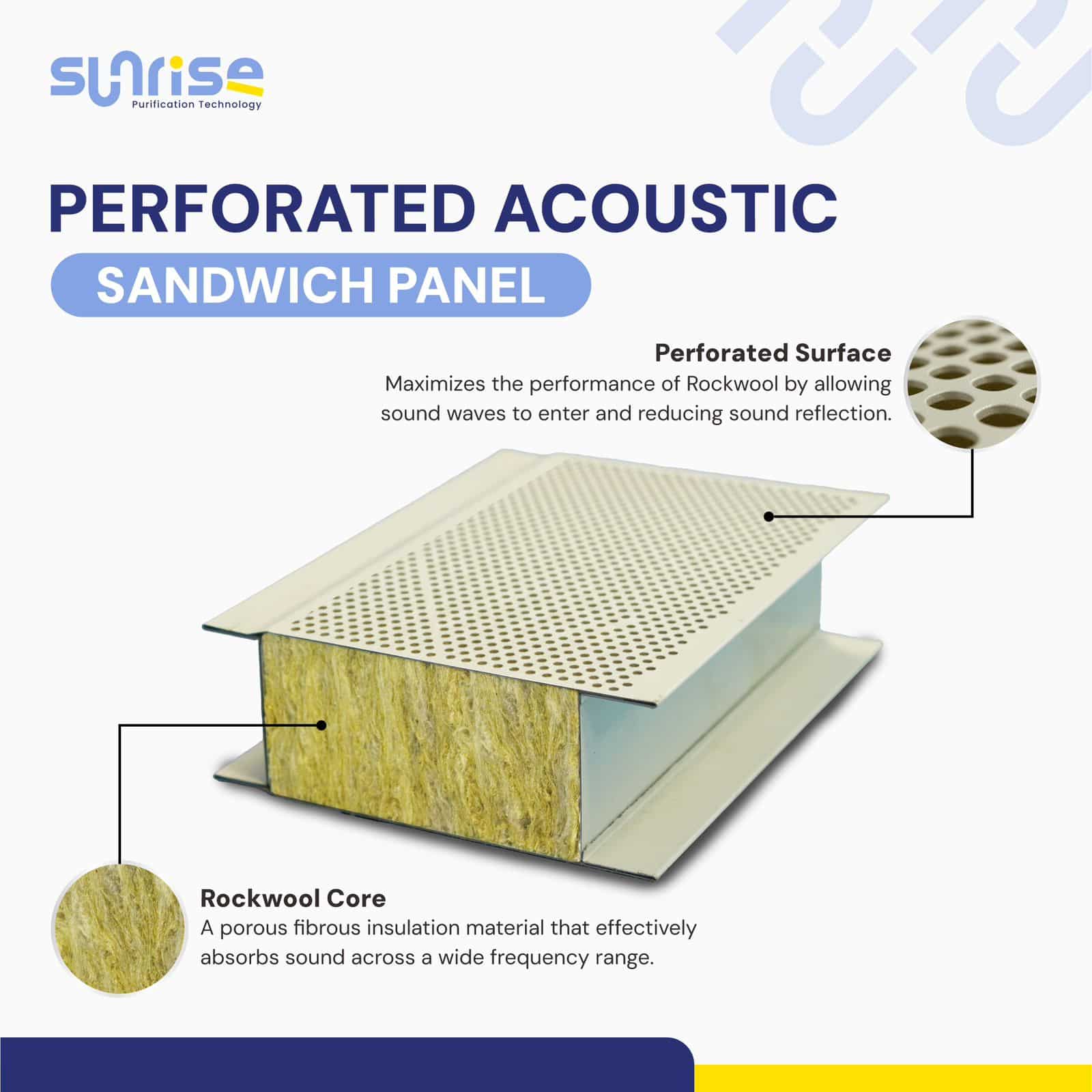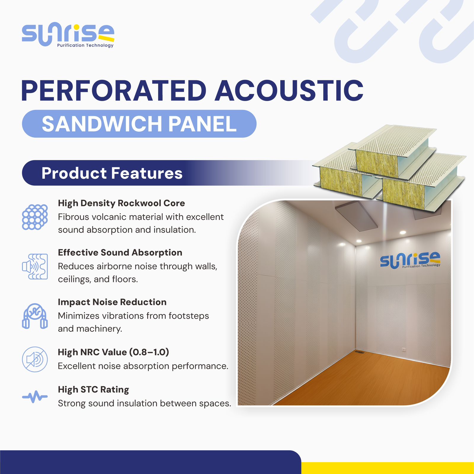 Perforated Acoustic Sandwich Panel dari Sunrise Purification Technology dirancang khusus untuk memberikan absorpsi suara (sound absorption) dan reduksi transmisi suara (sound insulation) yang optimal — cocok untuk studio musik, ruang meeting, auditorium, pabrik, hingga cleanroom rumah sakit.