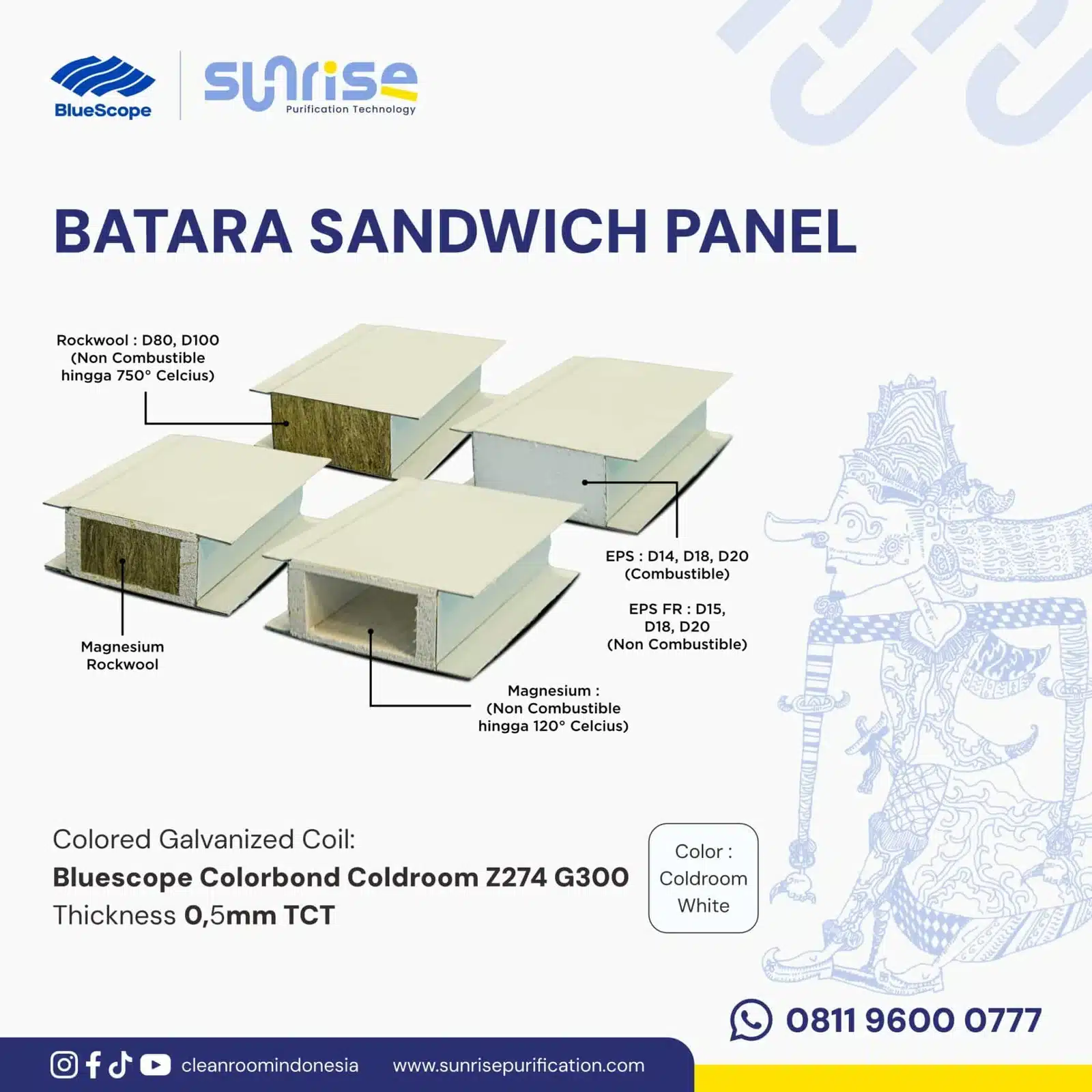 Magnesium Rockwool: Ini adalah solusi ultimate yang menggabungkan keunggulan Rockwool dan Magnesium. Core ini memberikan perlindungan kebakaran maksimal, insulasi akustik, serta permukaan yang higienis dan tahan lembab. Aplikasinya adalah untuk ruang produksi kritikal di industri bioteknologi, farmasi injeksi, dan ruang cleanroom kelas tinggi, di mana faktor keamanan, kebersihan, dan kenyamanan harus dipenuhi secara bersamaan.