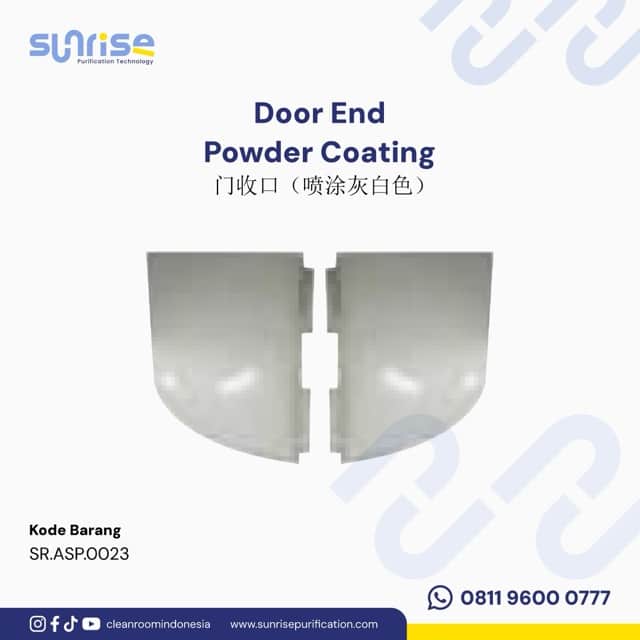 Door end corner adalah aksesories sandwichpanel yang dipasang pada sudut pintu antara internal curving dan frame pintu pada sistem sandwich panel cleanroom. Produk ini dirancang dengan radius lengkung R45 untuk menutup sudut tajam pada tepi dinding di sekitar kusen pintu, sehingga menghasilkan transisi yang halus, higienis, dan aman. Door End dipasang pada sisi kiri dan kanan bukaan pintu sebagai elemen finishing akhir.