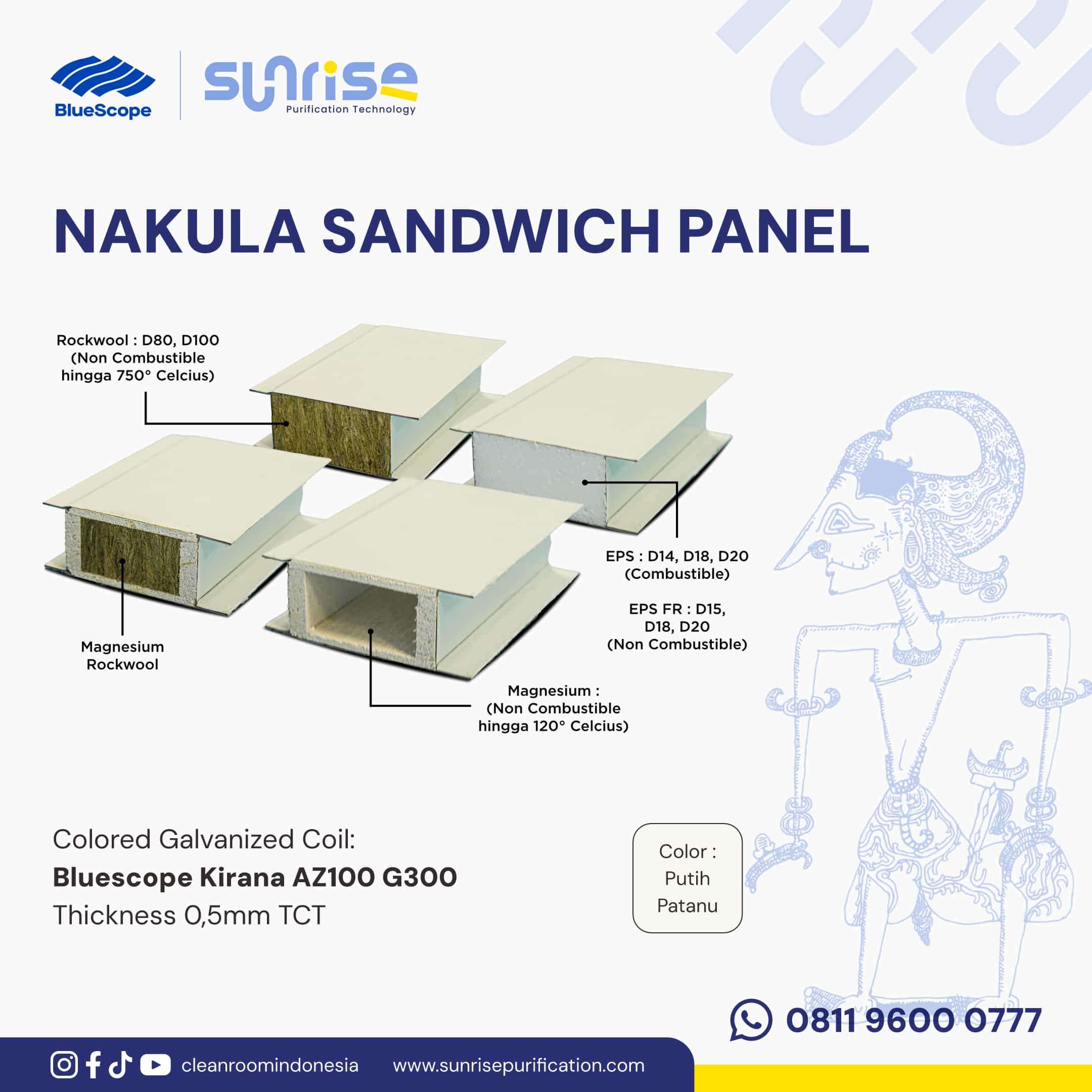 Magnesium Rockwool: Ini adalah solusi ultimate yang menggabungkan keunggulan Rockwool dan Magnesium. Core ini memberikan perlindungan kebakaran maksimal, insulasi akustik, serta permukaan yang higienis dan tahan lembab. Aplikasinya adalah untuk ruang produksi kritikal di industri bioteknologi, farmasi injeksi, dan ruang cleanroom kelas tinggi, di mana faktor keamanan, kebersihan, dan kenyamanan harus dipenuhi secara bersamaan.