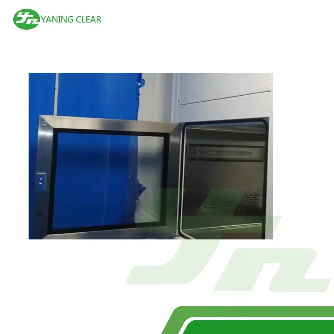 Struktur stainless steel SUS 304 memberikan ketahanan terhadap korosi dan kemudahan perawatan. Sistem interlock elektronik mencegah kedua pintu terbuka secara bersamaan, menjaga tekanan udara dan kebersihan di dalam ruang transfer.