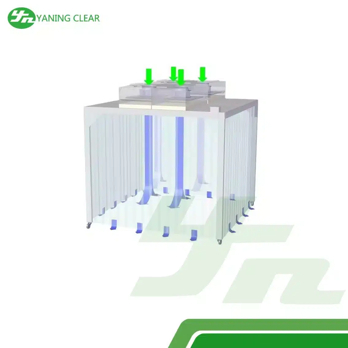Sistem ini dilengkapi dengan Fan Filter Unit (FFU) untuk menjaga sirkulasi udara bersih secara konstan dan Air Shower otomatis untuk menghilangkan partikel dari personel atau material sebelum memasuki area kerja steril. Kombinasi pre-filter dan HEPA filter memastikan efisiensi penyaringan hingga 99.995% terhadap partikel 0.3 mikron.